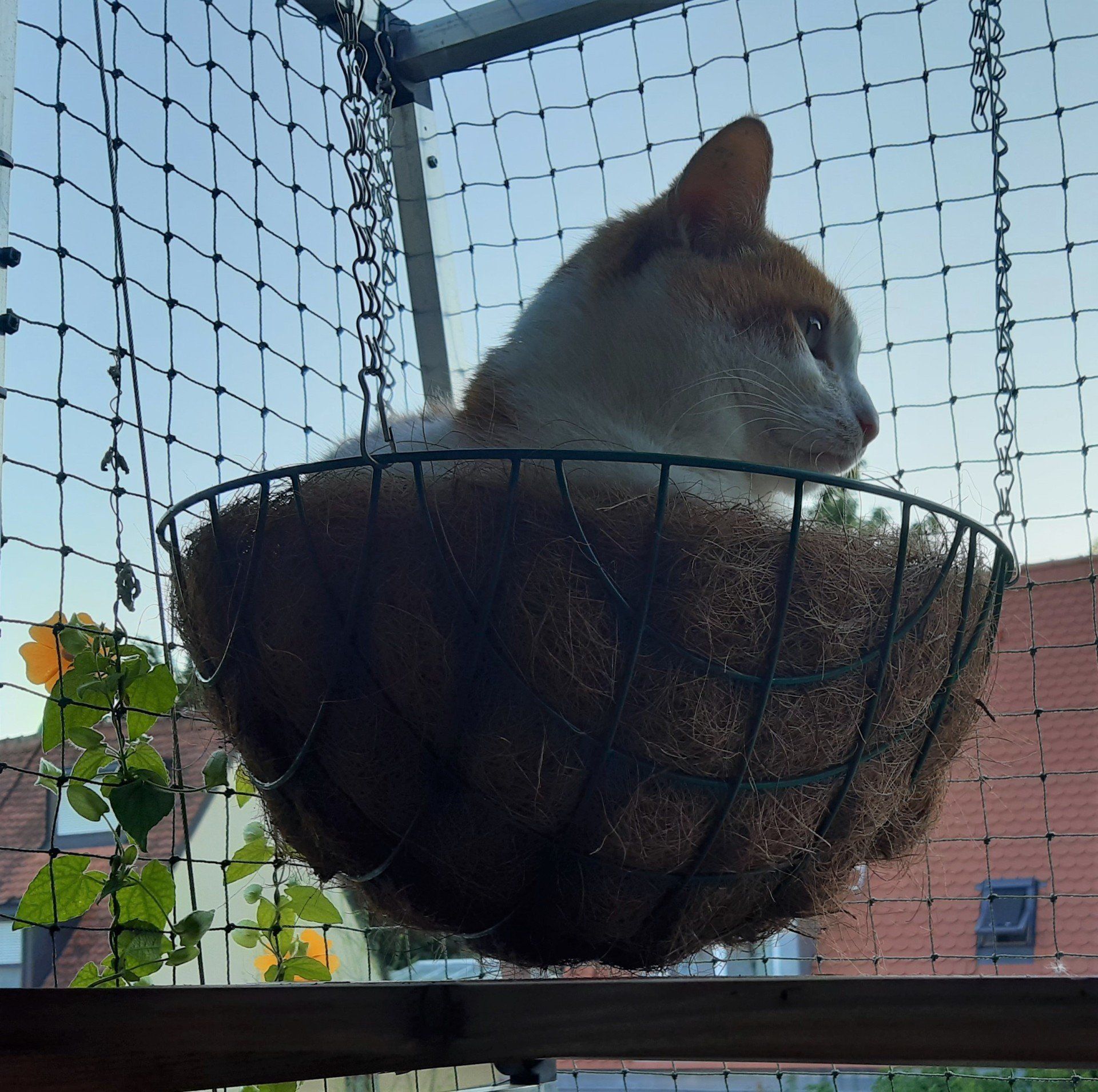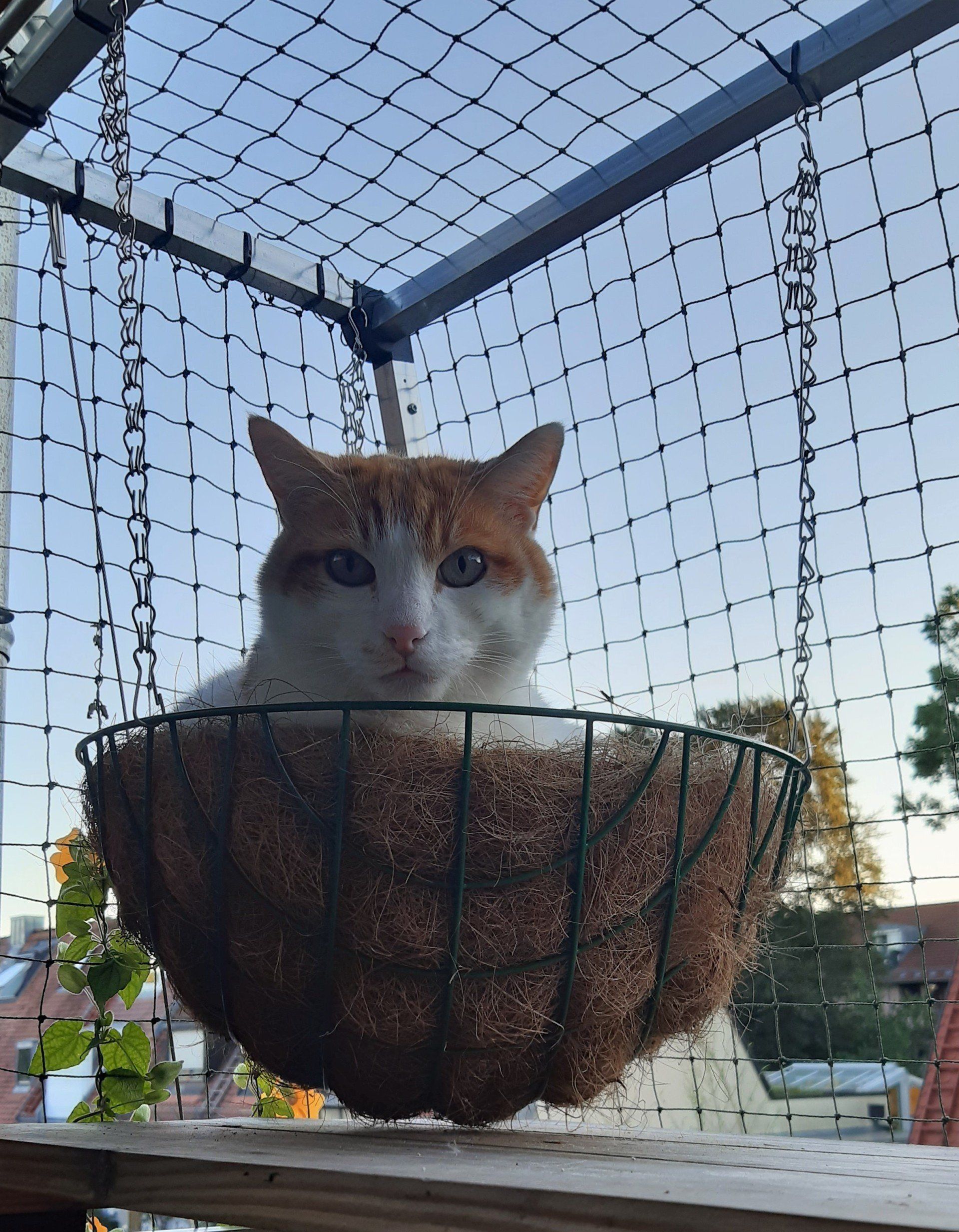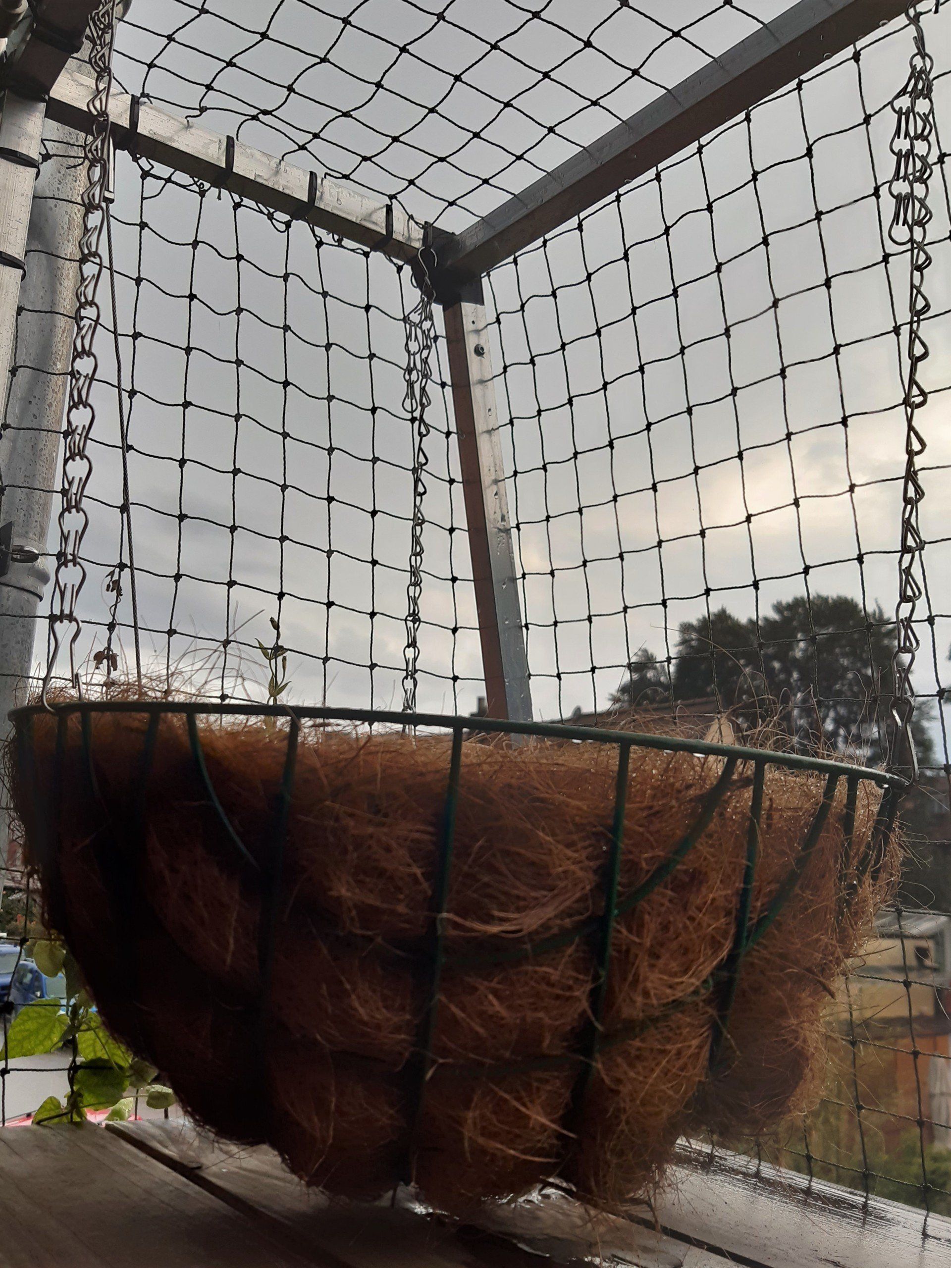 Als Aufhängung sind an den drei Kettchen Haken angebracht, die man mit Hilfe schmaler Kabelbinder am Gestänge des Katzenbalkons befestigen kann. Die Kettchen kann man in der Länge anpassen, indem man die Haken einfach in die passende Kettenöse setzt.