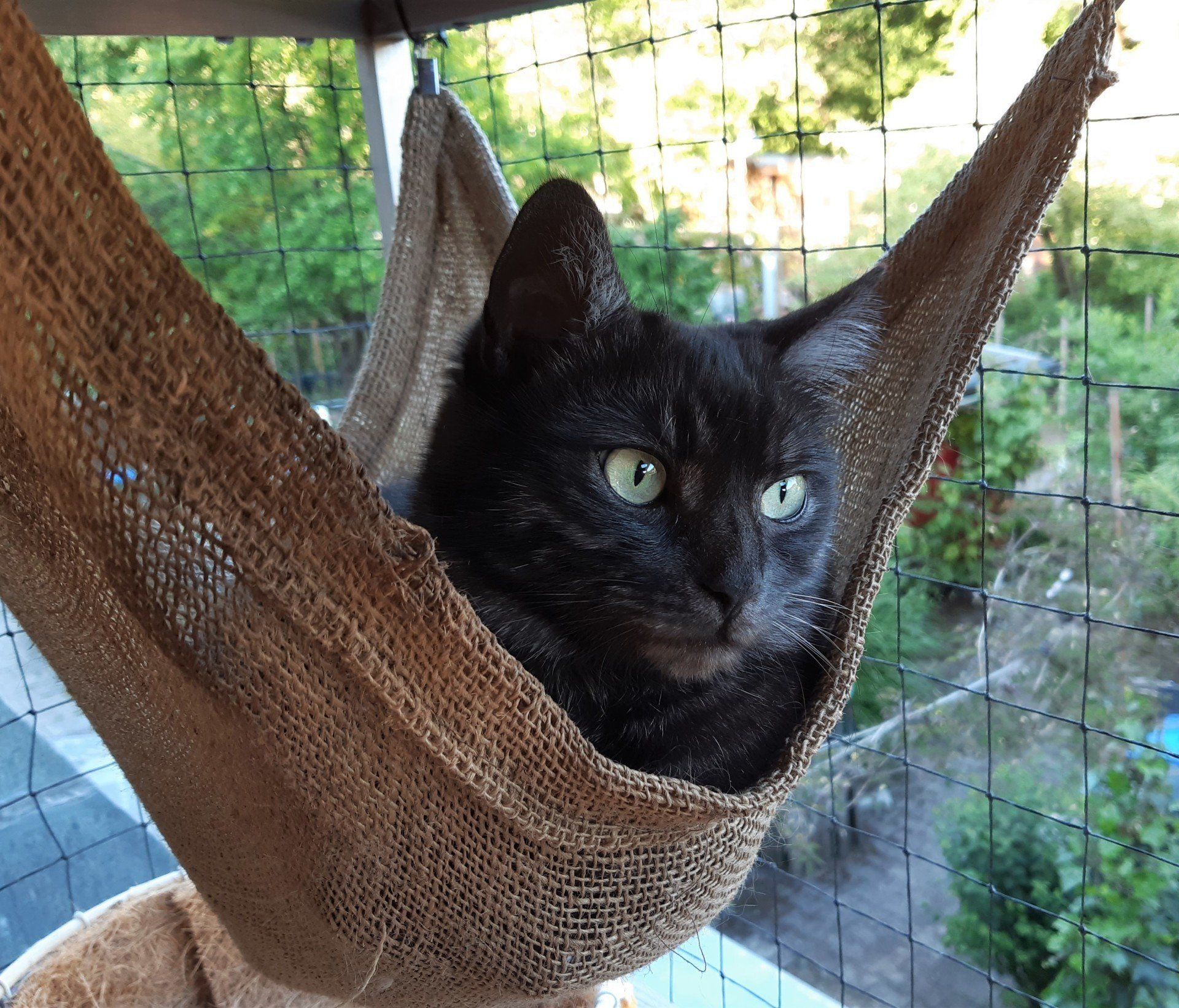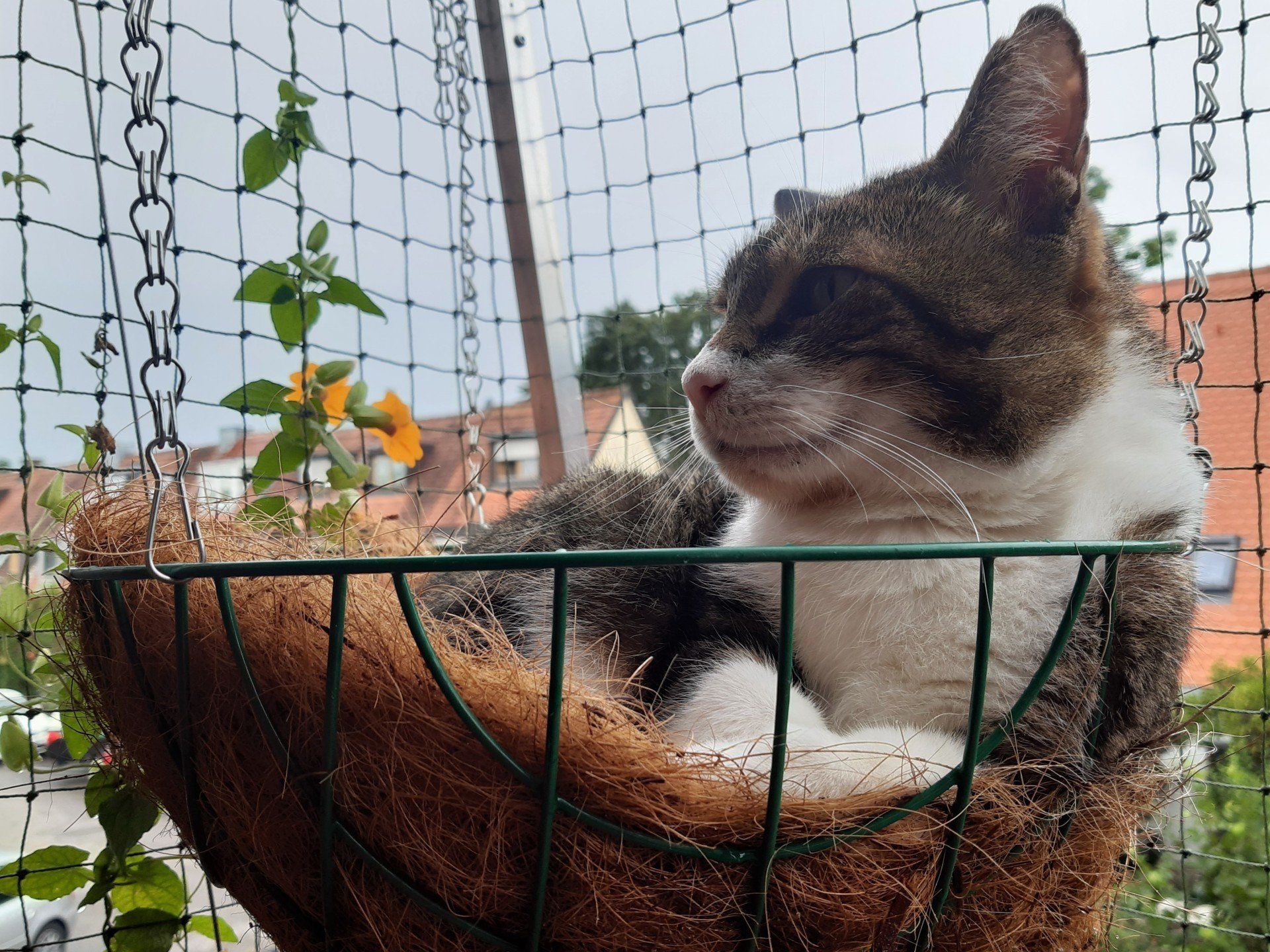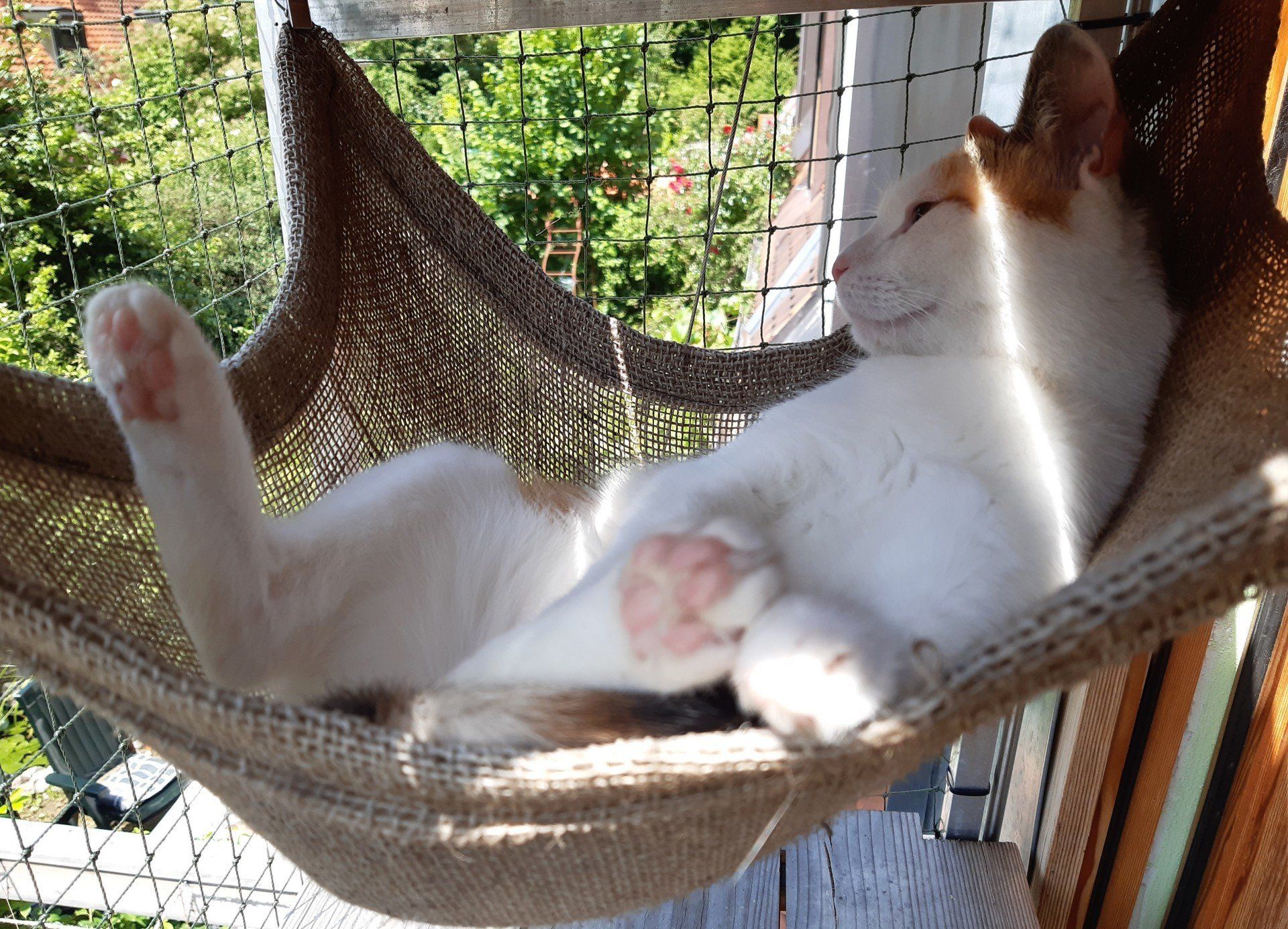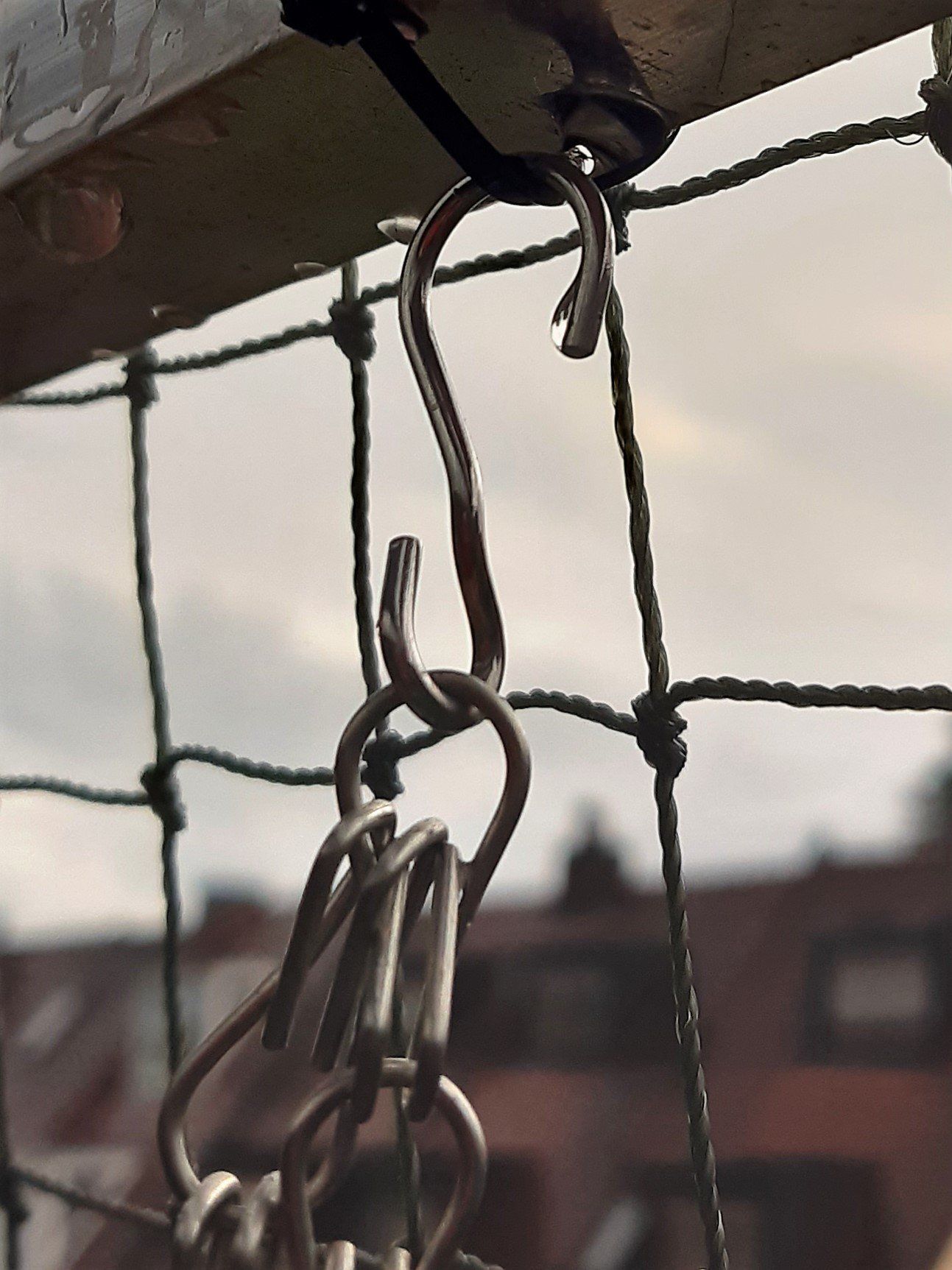 Als Aufhängung sind an den drei Kettchen Haken angebracht, die man mit Hilfe schmaler Kabelbinder am Gestänge des Katzenbalkons befestigen kann. Die Kettchen kann man in der Länge anpassen, indem man die Haken einfach in die passende Kettenöse setzt.