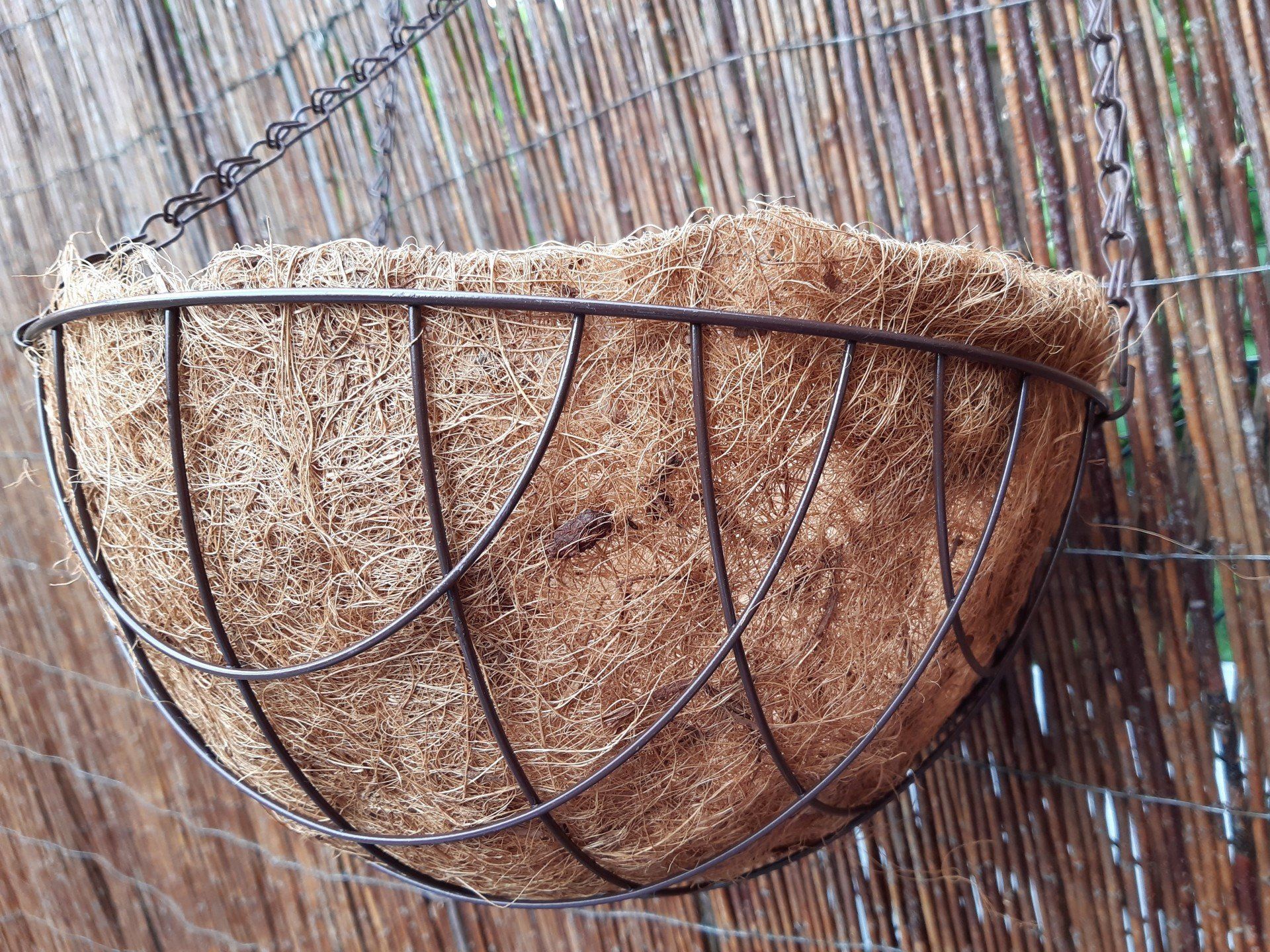 Die Einlage ist eine Kokosfasermatte, die im Lauf der Zeit etwas flauschiger wird und sehr wetterfest ist. Je nach Nutzung kann man sie nach einigen Jahren einfach austauschen, wenn sie sich zu sehr auflöst.