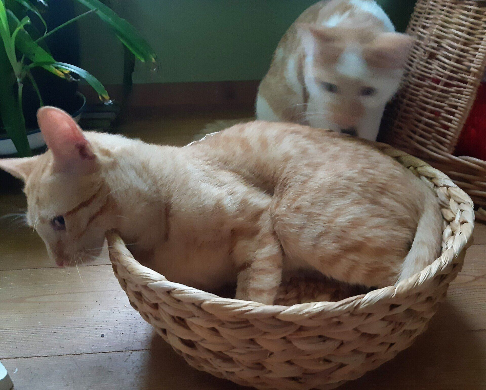 Katzen lieben kleine Körbchen, in denen sie sich einkuscheln können.