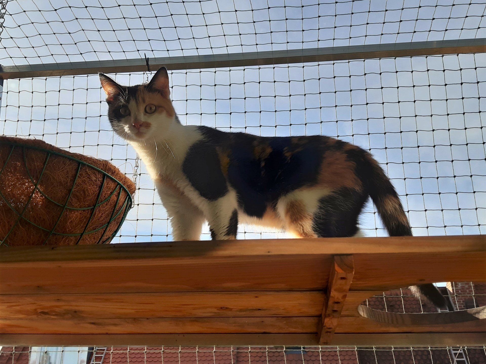 Als Aufhängung sind an den drei Kettchen Haken angebracht, die man mit Hilfe schmaler Kabelbinder am Gestänge des Katzenbalkons befestigen kann. Die Kettchen kann man in der Länge anpassen, indem man die Haken einfach in die passende Kettenöse setzt.